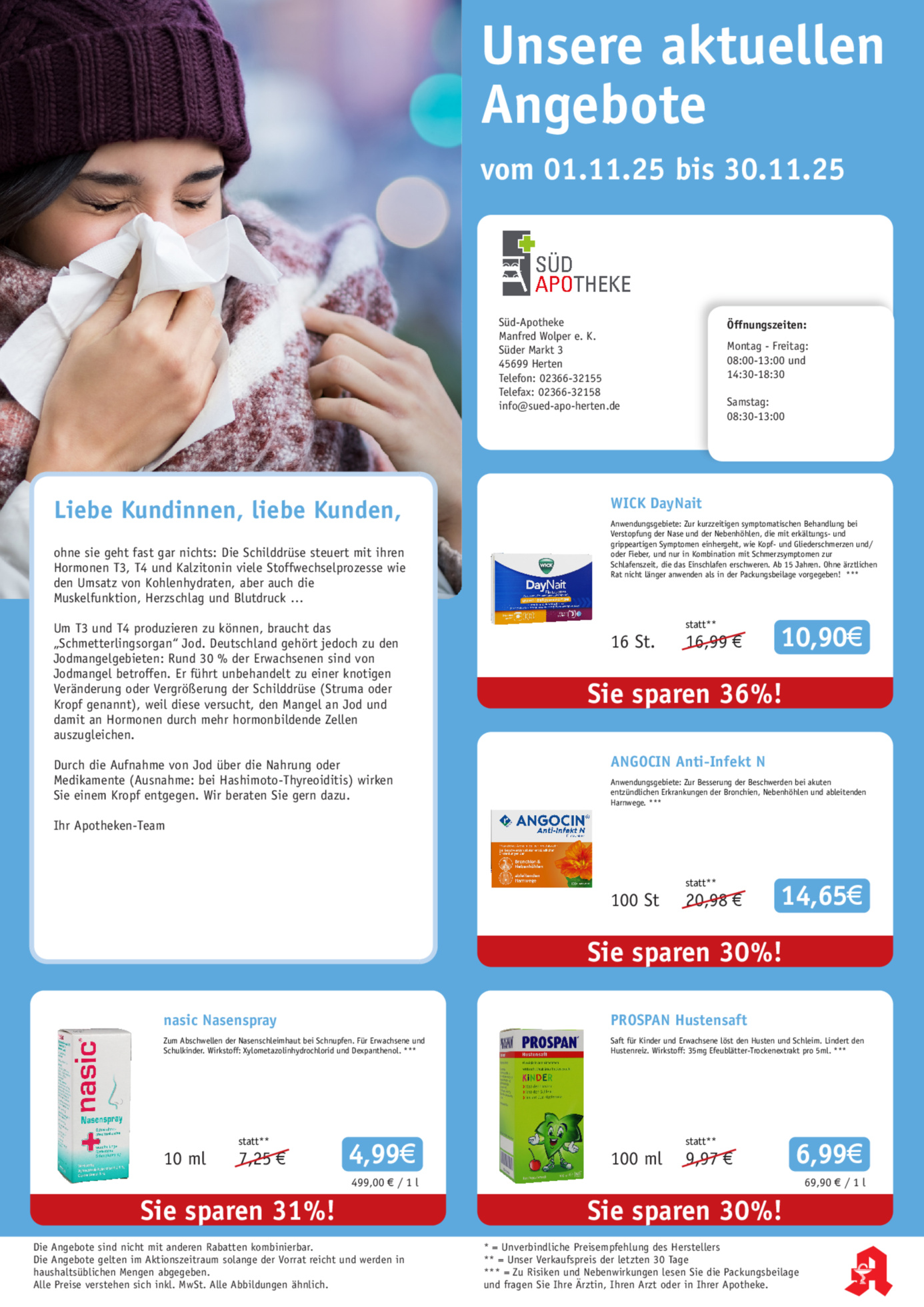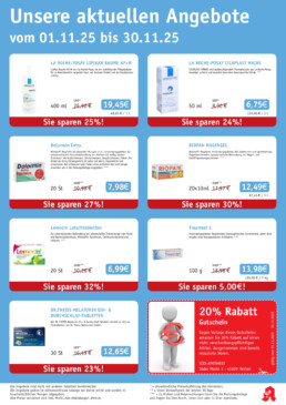 Unser erfahrenes Team aus Apothekerinnen und Apothekern sowie pharmazeutisch-technischen Assistentinnen und Assistenten berät Sie gerne persönlich vor Ort in unserer Apotheke oder auch online.